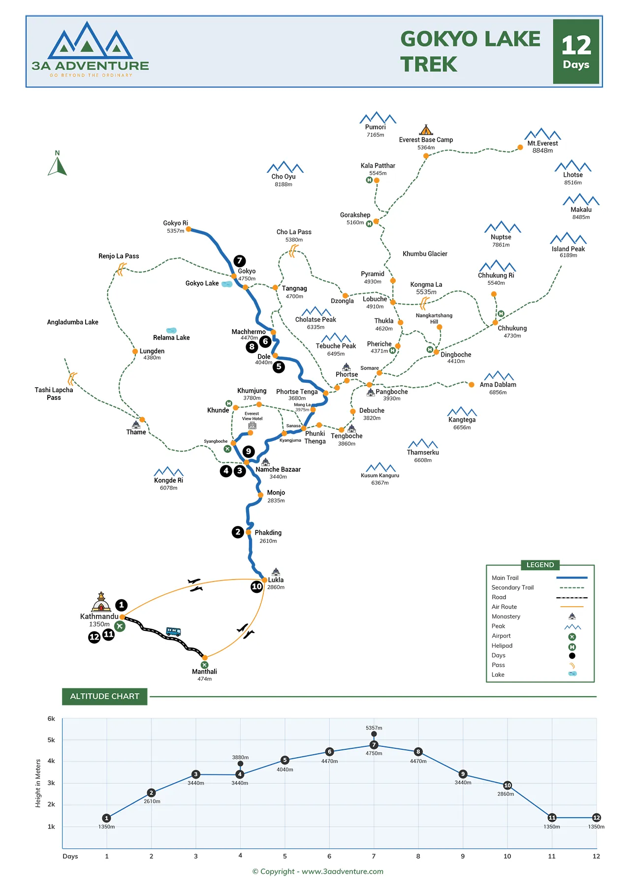 Max. Altitude: 5,357m/17,575ft. (Gokyo Ri)